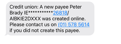 “A new payee has been added to your account. please contact us on (01) 5785614 if you did not create this payee.”